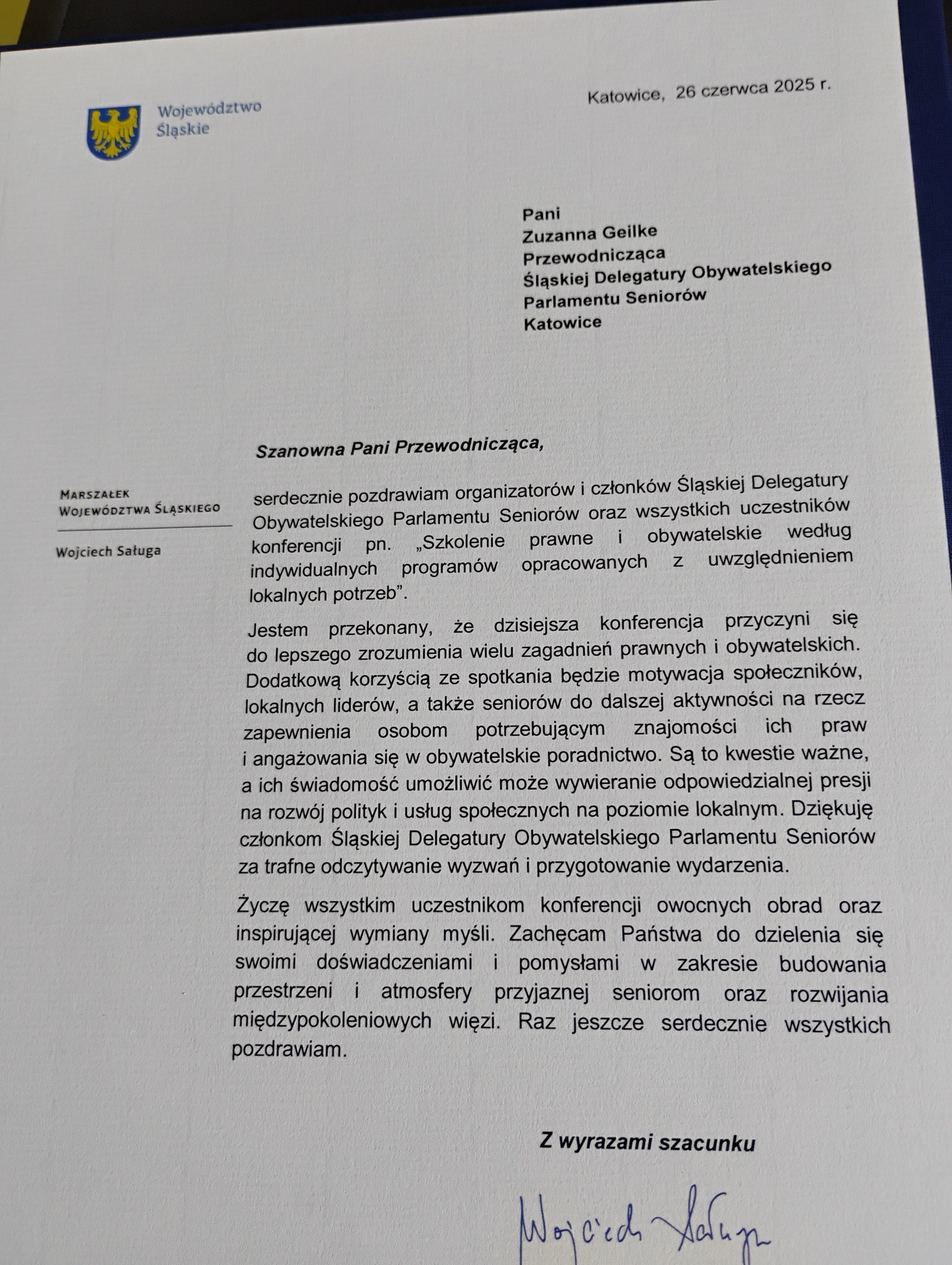 W Śląskim Urzędzie Wojewódzkim w Katowicach odbyła się konferencja pt. „Szkolenie prawne i obywatelskie według indywidualnych programów opracowanych z uwzględnieniem lokalnych potrzeb”, zorganizowana przez Śląską Delegaturę Obywatelskiego Parlamentu Seniorów, którą kieruje Zuzanna Sklorz Geilke oraz Pełnomocniczkę Wojewody Śląskiego ds. Polityki Senioralnej – Annę Jaśkowską.