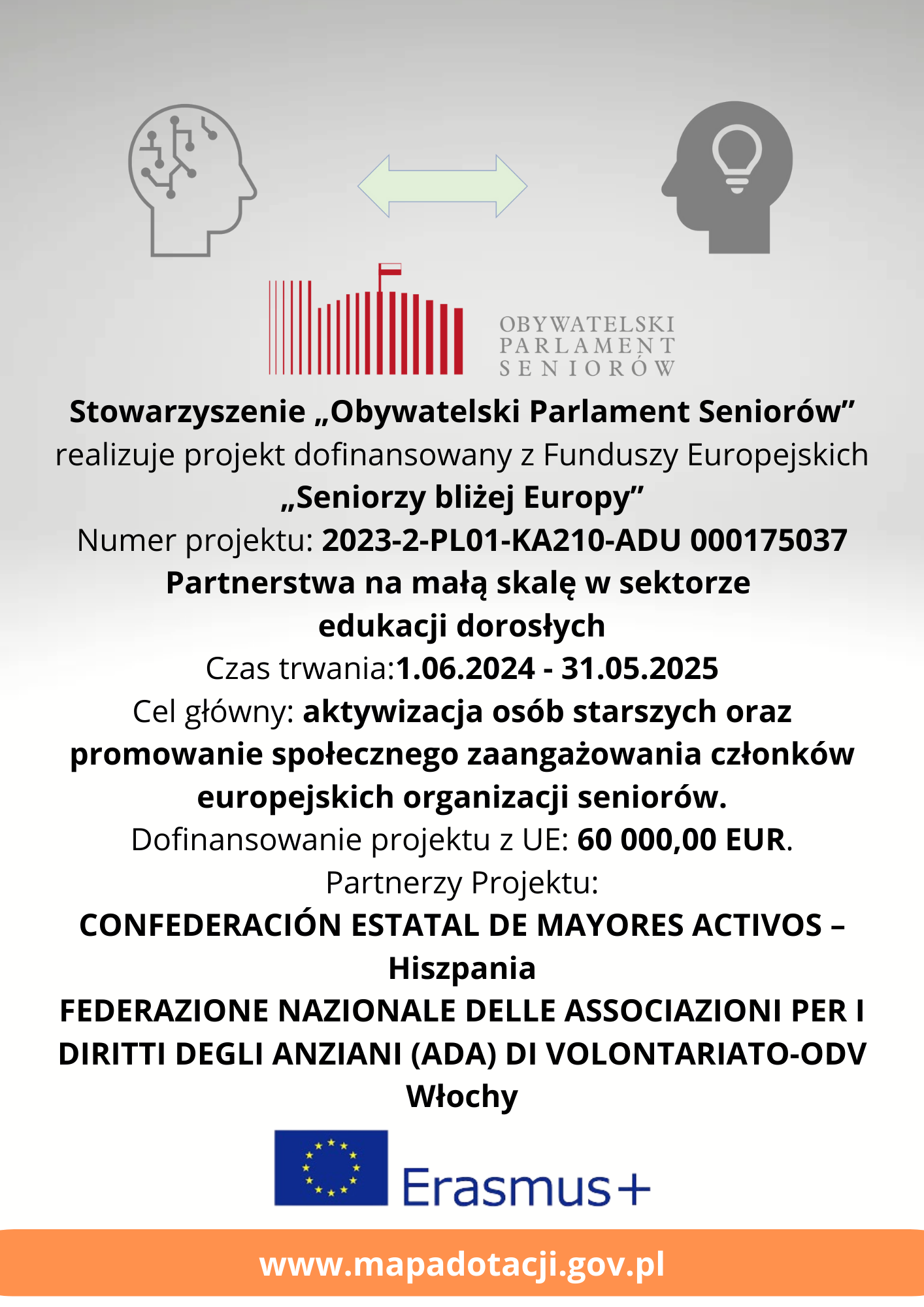 Numer projektu 2023-2-PL01-KA210-ADU-000175037. Partnerstwa na małą skalę w sektorze edukacji dorosłych. Czas trwania: 1.06.2024 – 31.05.2025. Cel główny: aktywizacja osób starszych oraz promowanie społecznego zaangażowania członków europejskich organizacji seniorów. Dofinansowanie projektu z UE: 60 000,00 EUR. Partnerzy Projektu: Confederación Estatal de Mayores Activos – Hiszpania, FEDERAZIONE NAZIONALE DELLE ASSOCIAZIONI PER I DIRITTI DEGLI ANZIANI (ADA) DI VOLONTARIATO – ODV – Włochy.